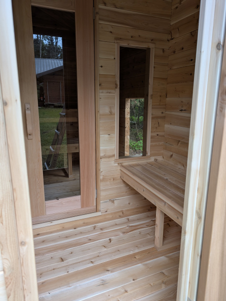 8'x8' white cedar cabin sauna with a 4' changeroom and a 4' porch.